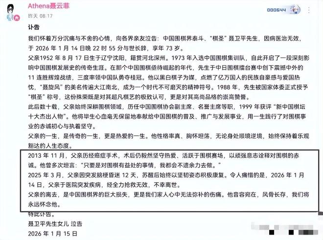 2026年1月14日,聂卫平离世。围棋界震动,老一辈集体缅怀,年轻一代重新认识这位民族符号。